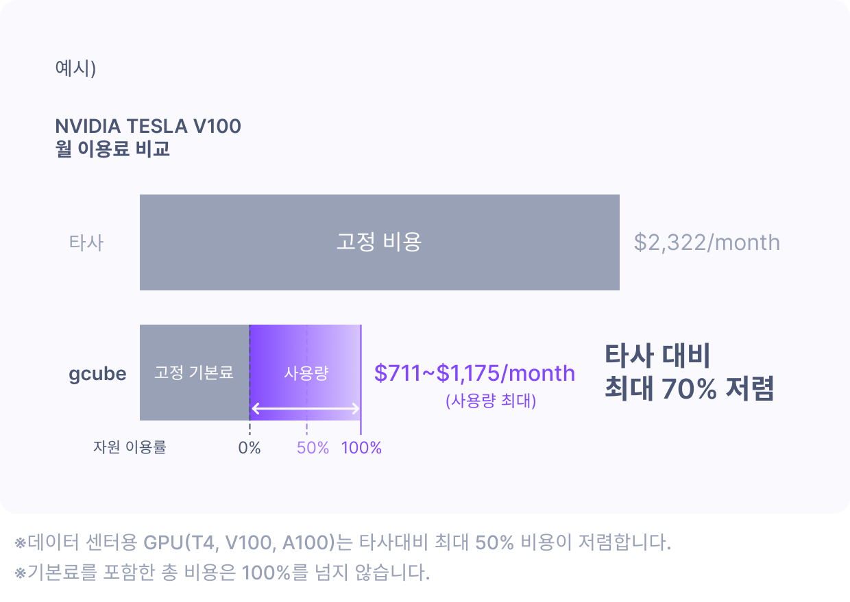 이용한 만큼의 과금방식으로 사용률이 낮을때는 타사대비 최대 70% 비용을 절감할 수 있으며, 최대 이용률일경우에도 타사보다 경쟁력 있는 가격으로 이용하실 수 있습니다.